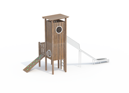 Первый - деревянные столбы и брёвна выполнены из лиственницы, имеют естественную природную форму, тщательно отшлифованы и обладают высочайшей прочностью.