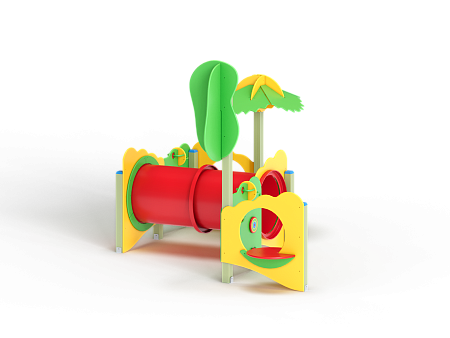 Лабиринт состоит из столбов и крепящихся к ним фанерных стенок с игровым оборудованием в виде мишеней, головоломок, детских счет, трубы-перехода пластиковой и фанерных столиков. На двух столбах установлены две декоративные фанерные крыши в форме кроны дерева и пальмы.