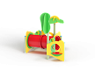 Лабиринт состоит из столбов и крепящихся к ним фанерных стенок с игровым оборудованием в виде мишеней, головоломок, детских счет, трубы-перехода пластиковой и фанерных столиков. На двух столбах установлены две декоративные фанерные крыши в форме кроны дерева и пальмы.