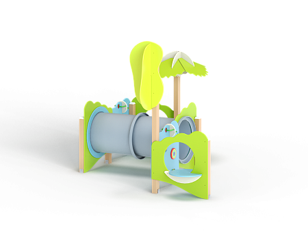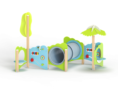 Лабиринт состоит из столбов и крепящихся к ним фанерных стенок с игровым оборудованием в виде мишеней, головоломок, детских счет, трубы-перехода пластиковой и фанерных столиков. На двух столбах установлены две декоративные фанерные крыши в форме кроны дерева и пальмы.