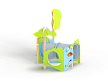 Лабиринт состоит из столбов и крепящихся к ним фанерных стенок с игровым оборудованием в виде мишеней, головоломок, детских счет, трубы-перехода пластиковой и фанерных столиков. На двух столбах установлены две декоративные фанерные крыши в форме кроны дерева и пальмы.