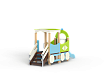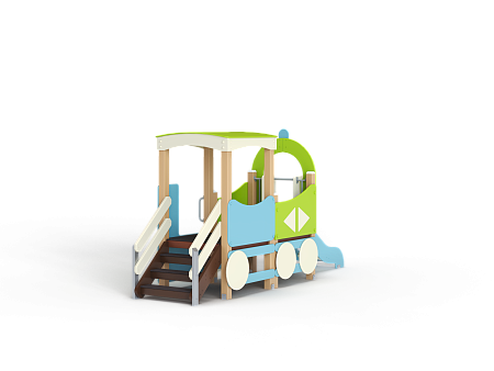 Паровозик состоит из кабины с крышей и лестницей, котла с горкой. Кабина имеет вход в виде альпинистской стенки и лестницы, две вспомогательные ручки, фанерное ограждение и крышу. Котел - открытая площадка с горкой, декоративной аркой и фанерным ограждением с художественным оформлением. Снизу по бокам расположены декоративные колеса.