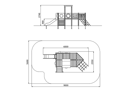 Комплекс скомпонован в форме кораблика с башней, на которой установлены лестница, горка, ограждение, сетка и крыша. Детали кораблика изготовлены из HPL пластика, тщательно отшлифованного бруса и металлических элементов из стали с оцинкованным покрытием, навес крыши изготовлен из экструдированного высокомолекулярного полиэтилена. Оцинковка металла производится методом электрохимической гальванизации. Скат горки изготовлен из нержавеющей стали. Сетка изготовлена из многожильного армированного износостойкого каната.