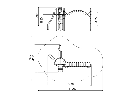 Универсальный комплекс состоит из башни с площадкой, каруселью и гимнастических элементов. Столбы башни выполнены из древесно-полимерного композита (ДПК) диаметром 125 мм, имею профиль с канавками. Все металлические гимнастические элементы и карусель выполнены из нержавеющей стали с антивандальными и безопасными соединениями между собой. Сетки и канаты изготовлены из многожильного армированного износостойкого каната. Площадка и сидение карусели выполнены из экструдированного высокомолекулярного полиэтилена.