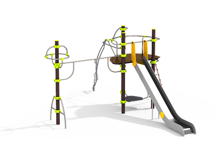 Универсальный комплекс состоит из башни с жесткой площадкой и площадкой подвесной, каруселью, горкой и гимнастических элементов. Столбы башни выполнены из древесно-полимерного композита (ДПК) диаметром 125 мм, имею профиль с канавками. Все металлические гимнастические элементы и карусель выполнены из нержавеющей стали с антивандальными и безопасными соединениями между собой. Сетки и канаты изготовлены из многожильного армированного износостойкого каната. Площадки и сидение карусели выполнены из экструдированного высокомолекулярного полиэтилена, борта и ограждения горки выполнены из HPL пластика. .
