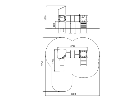 Универсальный комплекс состоит из двух башен с площадками, соединенных прозрачным пластиковым тунелем. Одна башня с крышей, ограждением и горкой, вторая башня с лестницей и ограждением. Все металлические элементы башен выполнены из стали с оцинкованным покрытием, с антивандальными и безопасными соединениями между собой. Оцинковка металла производится методом электрохимической гальванизации. Скат горки выпонен из нержавеющей стали. Площадки, стенки, крыша лестница, борта и ограждения горки выполнены из HPL пластика..