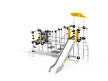 Универсальный комплекс состоит из гимнастического оборудования и двух башен с площадками, соединенных подвесным переходом. Одна башня с крышей, ручками и горкой, вторая башня с ограждением и ручками. Все металлические элементы башен и гимнастического оборудования выполнены из стали с оцинкованным покрытием, с антивандальными и безопасными соединениями между собой. Оцинковка металла производится методом электрохимической гальванизации. Скат горки выпонен из нержавеющей стали. Площадки, стенки, крыша, ручки, борта и ограждения горки выполнены из HPL пластика. Сетки и канаты изготовлены из многожильного армированного износостойкого каната