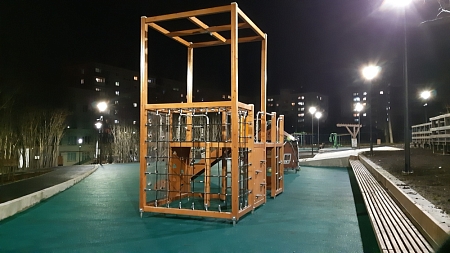 Универсальный комплекс состоит из двух сдвоенных башен с площадками и гимнастического оборудования с края одной из башен. На башнях установлены горка, альпинистские стенки и площадка с круглым лазом. Все металлические гимнастические элементы и выполнены из нержавеющей стали. Все деревянные элементы изготовлены из тщательно отшлифованной древесины и окрашены высококачественным лаковым покрытием. Площадки, альпинистские стенки, борта и ограждения горки выполнены из HPL пластика. Сетки и канаты изготовлены из многожильного армированного износостойкого каната.