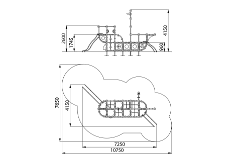 Комплекс выполнен в виде комбинации металлических элементов в собранном виде образующих форму корабля с мачтой, ограждениями и различным гимнастическим наполнением. Все металлические элементы выполнены из стали с оцинкованным покрытием, с антивандальными и безопасными соединениями между собой. Оцинковка металла производится методом электрохимической гальванизации. Площадки, стенки, ручки, лестница, выполнены из HPL пластика. Сетки и канаты изготовлены из многожильного армированного износостойкого каната.
