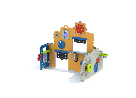 Комплекс состоит из комбинации элементов, выполненых из HPL пластика, в совокупности образующие домик мастерскую. Металлические элементы выполнены из стали с оцинкованным покрытием. Оцинковка металла производится методом электрохимической гальванизации.