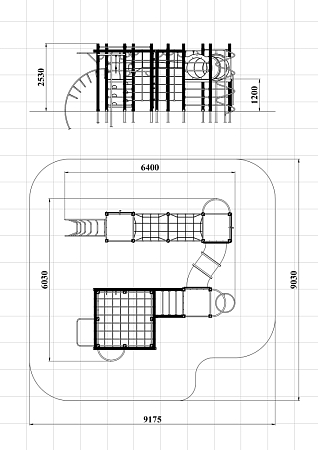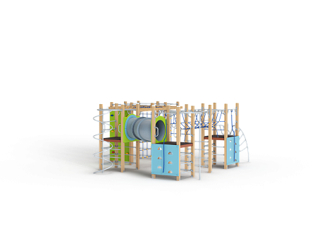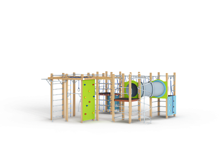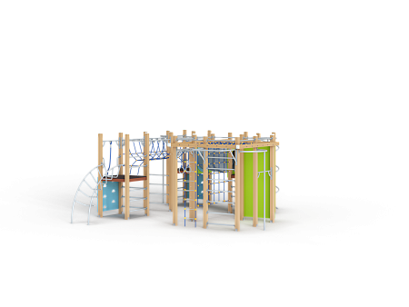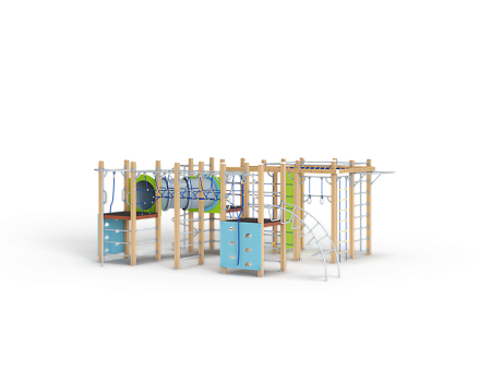 Спортивный комплекс состоит трёх башен, соединенных между собой сеткой полипропиленовой и изогнутой трубой переходом пластиковым. Одна из башен соединена со спортивным комплексом. На башнях и на спорткомплексе установлены перекладины усиленные, лиана, шест, шест спираль, перекладины, ручки вспомогательные, альпинистская стенка, перекладины с канатом, сетки полипропиленовые, лестница полипропиленовая, перекладина с кольцами гимнастическими и турник навесной