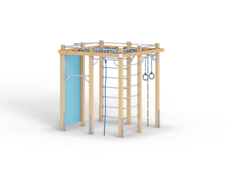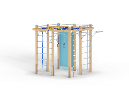 Спортивный комплекс оборудован вертикальной полипропиленовой сеткой, шестом, шведскими стенками, кольцам гимнастическими, полипропиленовой лестницей, канатом, перекладинами, фанерной стенкой с альпинистскими камнями и приставным турником