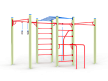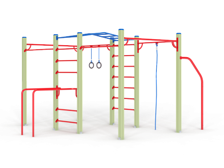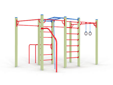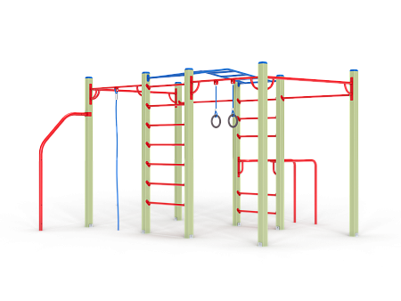 Спортивный комплекс оборудован рукоходом изогнутым, шведскими стенками, брусьями изогнутыми, кольцам гимнастическими, канатом, перекладинами, стойкой упорной.