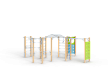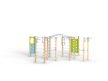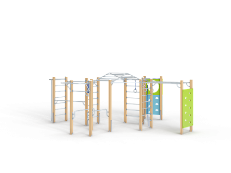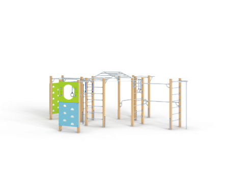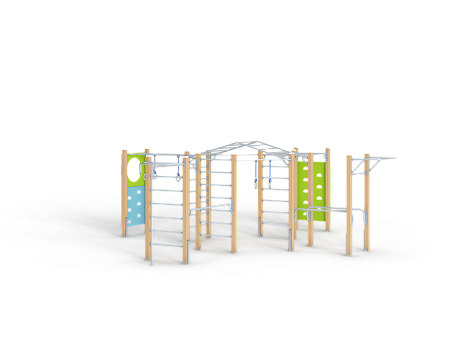 Спортивный комплекс оборудован рукоходом, рукоходом изогнутым, рукоходом с гимнастическими кольцами, шведскими стенками, брусьями межстолбовыми, кольцам гимнастическими, канатом, шестом, перекладинами, альписнистскими стенками, фанерной стенкой с круглым вырезом, ручкам вспомогательными и турником приставным.