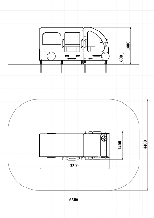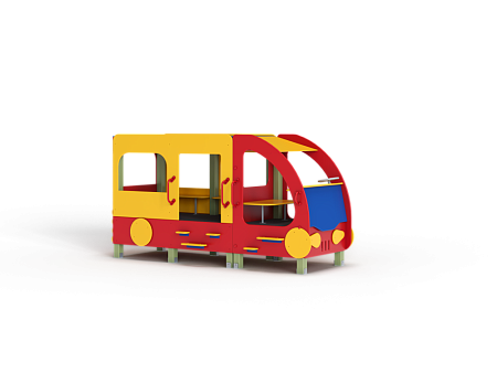 Автобус состоит из двух площадок в виде кабины и кузова с бортовыми фанерными ограждениями иммитирующих детали автобуса. Кабина имеет вход с двух сторон, по две ступеньки и по две ручки с каждой стороны, вращающийся руль и сидение. Кузов - площадка, имеющая один вход и скамейки внутри. У входа в кузов установлены три ступеньки и две ручки.