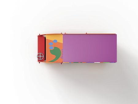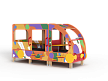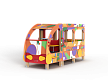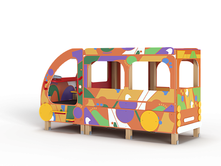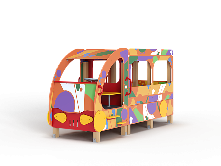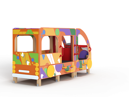 Автобус состоит из двух площадок в виде кабины и кузова с бортовыми фанерными ограждениями иммитирующих детали автобуса с художественным оформлением в стиле граффити. Кабина имеет вход с двух сторон, по две ступеньки и по две ручки с каждой стороны, вращающийся руль и сидение. Кузов - площадка, имеющая один вход и скамейки внутри. У входа в кузов установлены три ступеньки и две ручки.