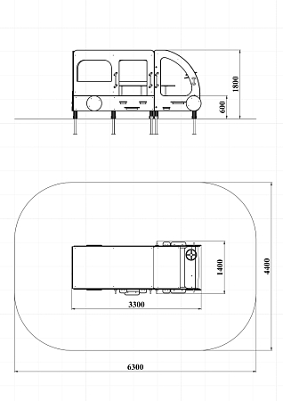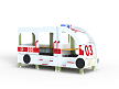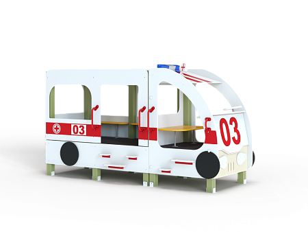 Автобус состоит из двух площадок в виде кабины и кузова с бортовыми фанерными ограждениями иммитирующих детали автобуса в цветовой гамме службы скорой помощи с художественным оформлением. Кабина имеет вход с двух сторон, по две ступеньки и по две ручки с каждой стороны, вращающийся руль и сидение. Кузов - площадка, имеющая один вход и скамейки внутри. У входа в кузов установлены три ступеньки и две ручки..