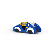 Машинка выполнена из фанерных деталей с раскраской в цветах службы ДПС, металлокаркаса, декоративных фанерных элементов и двух рулей.