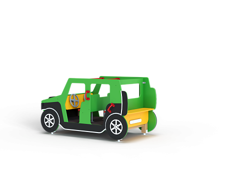 Вездеход состоит из площадки с фанерными элементами в виде кузовных деталей, ручек, вращающегося руля, металлических перекладин и сидений со спинками. За задней стенкой вездехода крепится фанерное сидение.