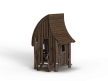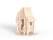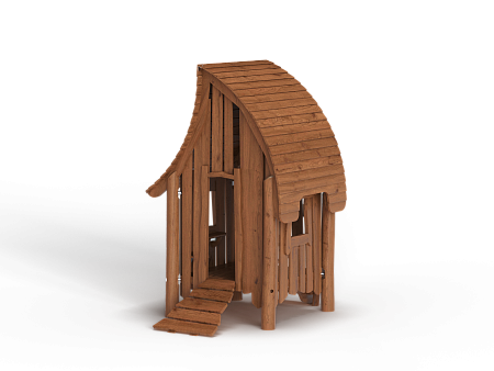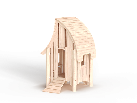 Комплекс выполнен из комбинации элементов, в совокупности образующие домик с площадкой, крышей, лестницей и трапом. Металлические элементы выполнены нержавеющей стали.