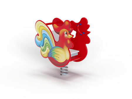 Качалка на пружине в форме петушка изготовлена из фанерных элементов с ручной художественной росписью и металлических элементов с пружиной.