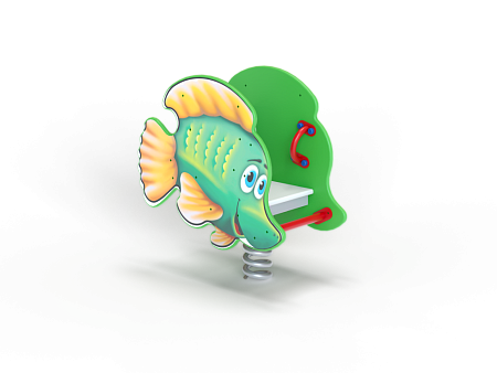 Качалка на пружине в форме рыбки изготовлена из фанерных элементов с ручной художественной росписью и металлических элементов с пружиной.