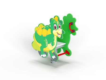 Качалка на пружине в форме динозаврика изготовлена из фанерных элементов с ручной художественной росписью и металлических элементов с пружиной.