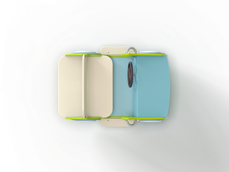 Качалка на пружине в форме кабриолета изготовлена из фанерных элементов, вращающегося руля и металлических элементов с пружиной.