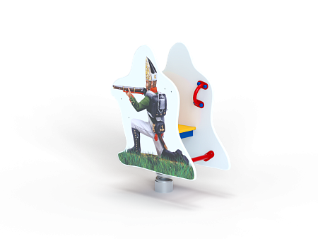 Качалка на пружине в форме гвардейца изготовлена из фанерных элементов с ручной художественной росписью и металлических элементов с пружиной.