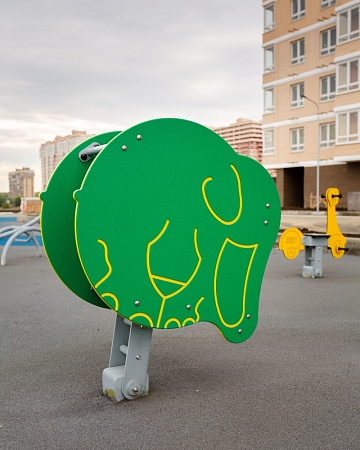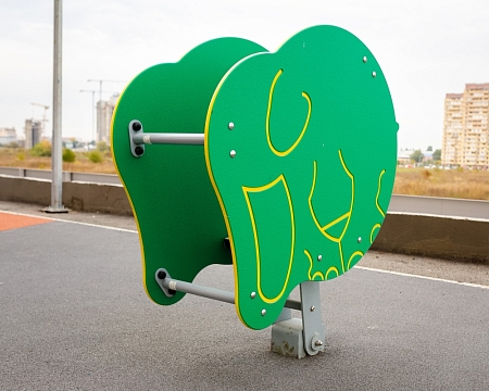 Качалка состоит из элементов выполненных из HPL пластика в форме слона и элементов выполненных из стали с оцинкованным покрытием. Оцинковка металла производится методом электрохимической гальванизации. Сиденье выполнено из экструдированного высокомолекулярного полиэтилена. Качение производится при помощи особых шарниров, при работе которых исключены места трения металлических компонентов шарнира, что в свою очередь влияет на долговечность, сокращает эксплуатационные расходы и позволяет шарниру работать практически без шума.