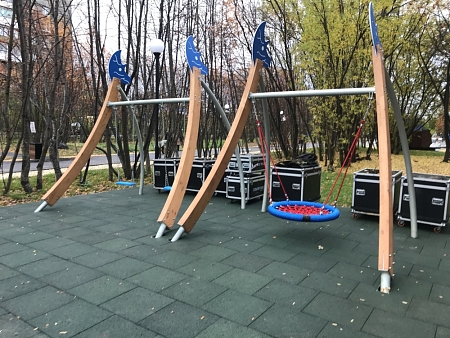 Балка качели и опорные дуги качели выполнены из стали с оцинкованным покрытием. Оцинковка металла производится методом электрохимической гальванизации. Опорные стойки качели выполнены из тщательно отшлифованной древесины высочайшей прочности и окрашены высококачественным лаковым покрытием. Декоративные накладки изготовлены из экструдированного высокомолекулярного полиэтилена. Подвес качели имеет форму гнезда. Сетки и канаты изготовлены из многожильного армированного износостойкого каната.