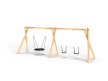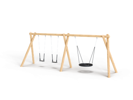Качели двойные для подвеса гнездо и двух сидений выполнены из восьми брёвен. Брёвна выполнены из лиственницы, имеют естественную природную форму, тщательно отшлифованы и обладают высочайшей прочностью. Брёвна покрыты в три слоя специальной пропиткой финского производства, содержащую антисептики и обеспечивающую ультрафиолетовую защиту от солнечного воздействия. Сетка подвеса гнездо изготовлена из многожильного армированного износостойкого каната.