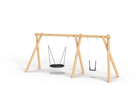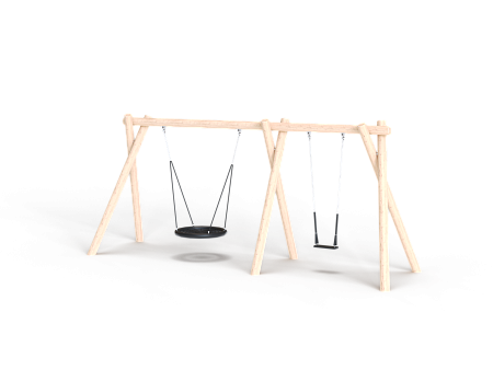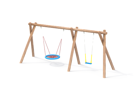 Качели двойные для подвеса гнездо и двух сидений выполнены из восьми брёвен. Брёвна выполнены из лиственницы, имеют естественную природную форму, тщательно отшлифованы и обладают высочайшей прочностью. Брёвна покрыты в три слоя специальной пропиткой финского производства, содержащую антисептики и обеспечивающую ультрафиолетовую защиту от солнечного воздействия. Сетка подвеса гнездо изготовлена из многожильного армированного износостойкого каната.