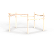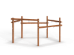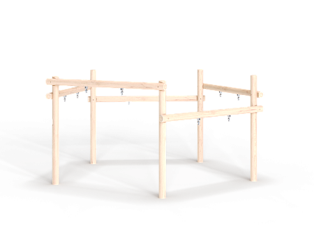 Рама качелей для пяти сидений выполнена из десяти бревен обвязанных в виде пятиугольника. Брёвна выполнены из лиственницы, имеют естественную природную форму, тщательно отшлифованы и обладают высочайшей прочностью. Брёвна покрыты в три слоя специальной пропиткой финского производства, содержащую антисептики и обеспечивающую ультрафиолетовую защиту от солнечного воздействия.