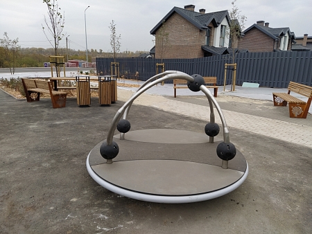 Карусель состоит из металлического каркаса, окрашенного порошковой полимерной краской, поручней из нержевеющей стали с антивандальными и безопасными соединениями между собой, площадок из экструдированного высокомолекулярного полиэтилена.