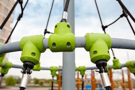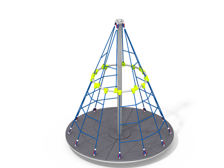 Карусель веревочная состоит из металлического каркаса, колпака и кольца из стали с оцинкованным покрытием, площадки и канатного обвеса. Канаты изготовлены из многожильного армированного износостойкого каната. Оцинковка металла производится методом электрохимической гальванизации. Пол выполнен из экструдированного высокомолекулярного полиэтилена.