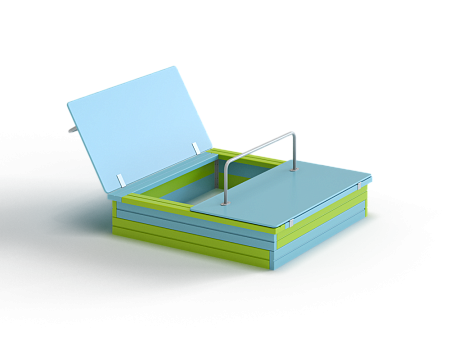 Песочница выполнена из бруса скрепленного между собой при помощи металлических закладных стоек и распашных фанерных крышек с металлическими ручками-опорами..