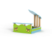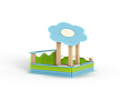 Песочница выполнена из бруса, фанерных стенок, опорных столбов, фанерных накладок-сидений и фанерного навеса в форме ромашки.