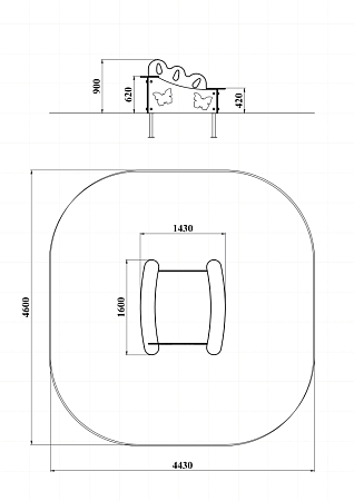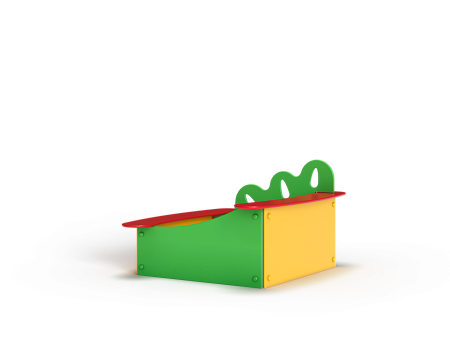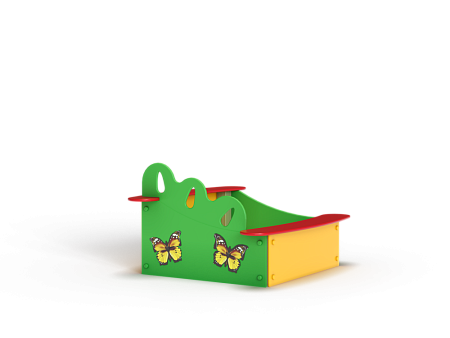 Песочница выполнена из фанерных стенок с художественным оформлением, опорных столбов и фанерных накладок-сидений.