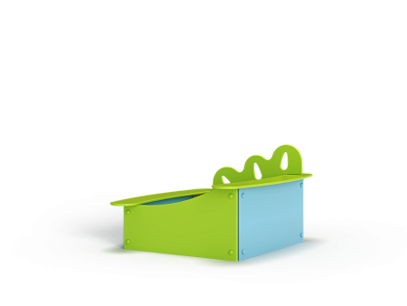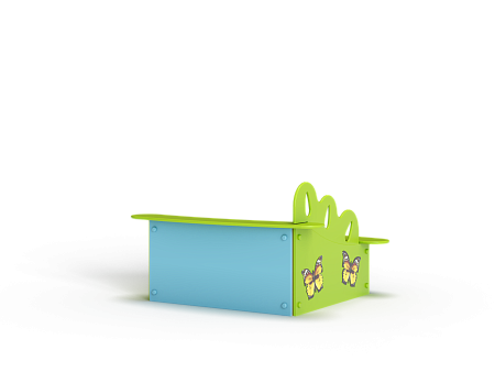 Песочница выполнена из фанерных стенок с художественным оформлением, опорных столбов и фанерных накладок-сидений.