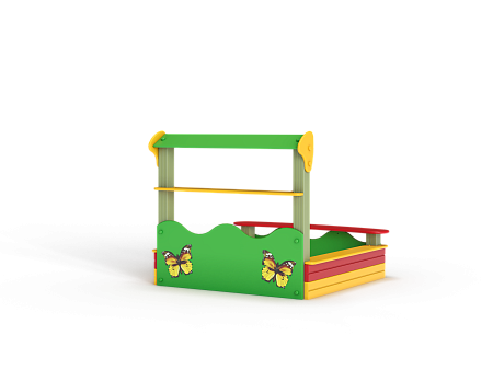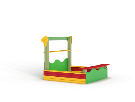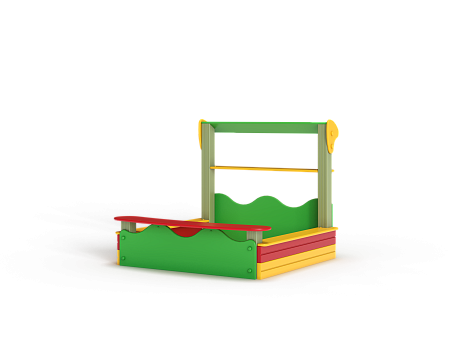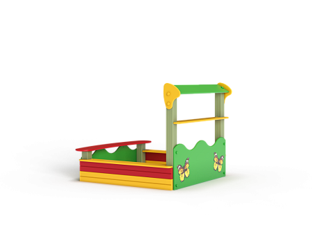 Песочница выполнена из бруса, фанерных стенок с художественным оформлением, опорных столбов, фанерных накладок-сидений и фанерного спойлера.