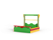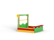 Песочница выполнена из бруса, фанерных стенок с художественным оформлением, опорных столбов, фанерных накладок-сидений и фанерного спойлера.