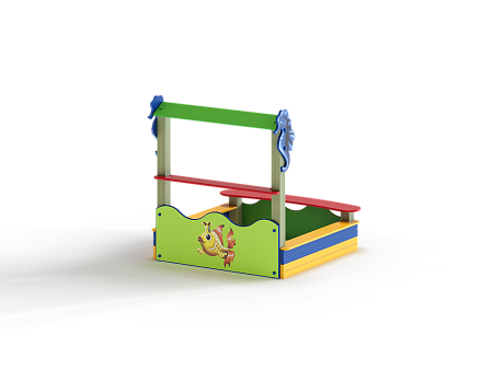 Песочница представлена в морской тематике. Выполнена из бруса, фанерных стенок с художественным оформлением, опорных столбов, фанерных накладок-сидений и фанерного спойлера с фанерными стойками в форме морских коньков.