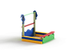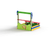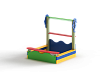 Песочница представлена в морской тематике. Выполнена из бруса, фанерных стенок с художественным оформлением, опорных столбов, фанерных накладок-сидений и фанерного спойлера с фанерными стойками в форме морских коньков.