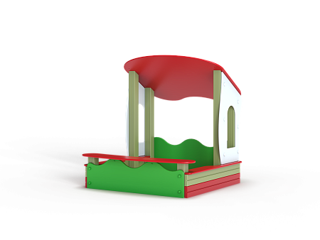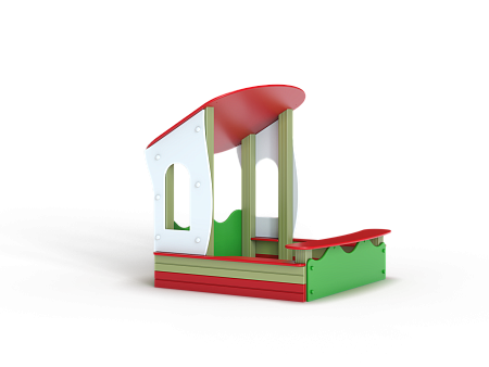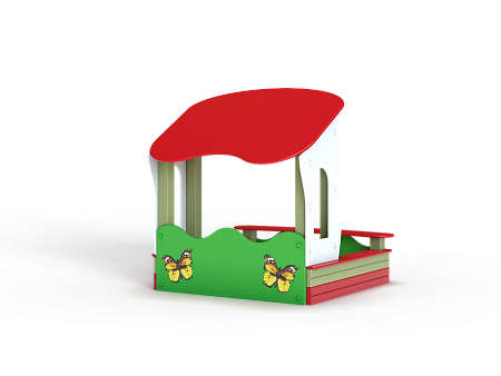 Песочница с навесом выполнена из бруса, фанерных стенок с художественным оформлением, опорных столбов, фанерных накладок-сидений, фанерного навеса.
