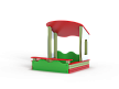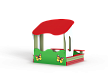 Песочница с навесом выполнена из бруса, фанерных стенок с художественным оформлением, опорных столбов, фанерных накладок-сидений, фанерного навеса.