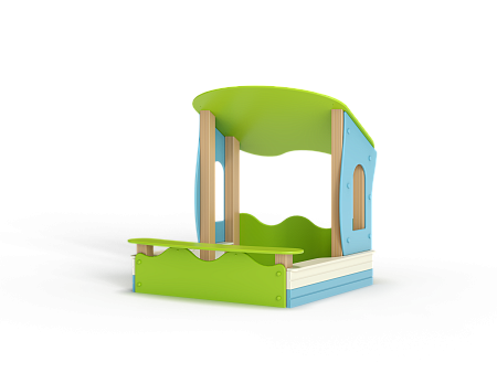 Песочница с навесом выполнена из бруса, фанерных стенок с художественным оформлением, опорных столбов, фанерных накладок-сидений, фанерного навеса.