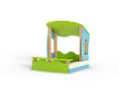 Песочница с навесом выполнена из бруса, фанерных стенок с художественным оформлением, опорных столбов, фанерных накладок-сидений, фанерного навеса.