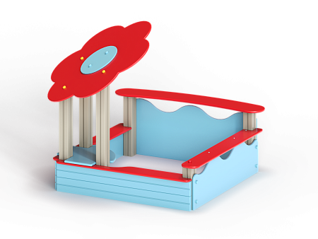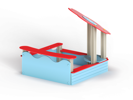 Песочница выполнена из бруса, фанерных стенок, опорных столбов, фанерных накладок-сидений и фанерного навеса в форме ромашки.