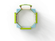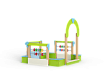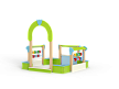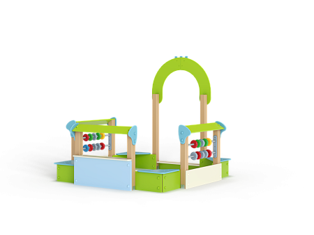 Песочница состоит из столбов с прикрепленными к ним по периметру фанерными ограждениями. Вход в песочницу выполнен в виде декоративной фанерной арки. Между боковыми столбами расположены два комплекта счет с разноцветными пластиковыми бубликами. На столбах установлены три спойлера, один расположен напротив арочного входа, два других на столбах со счетами.